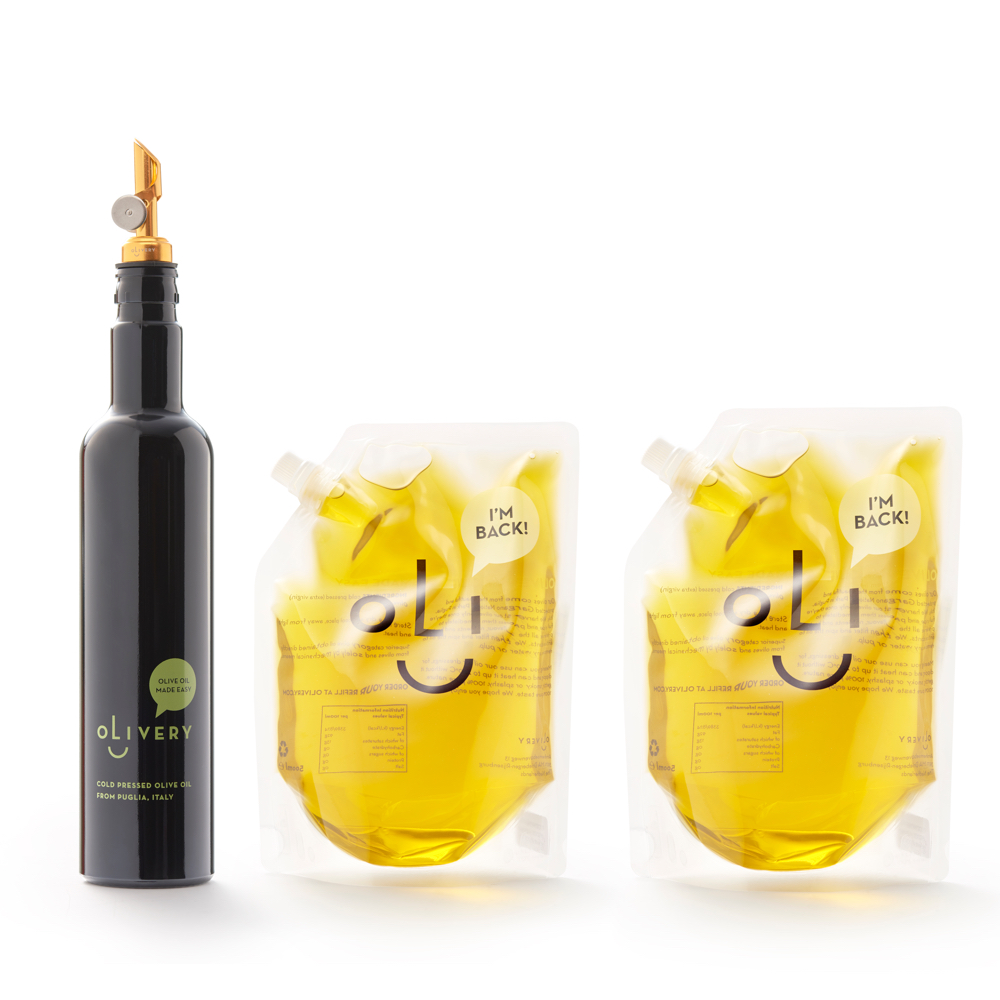 This starter kit contains the Basic Bottle, two refills with 450 ml cold pressed olive oil and a design pourer.